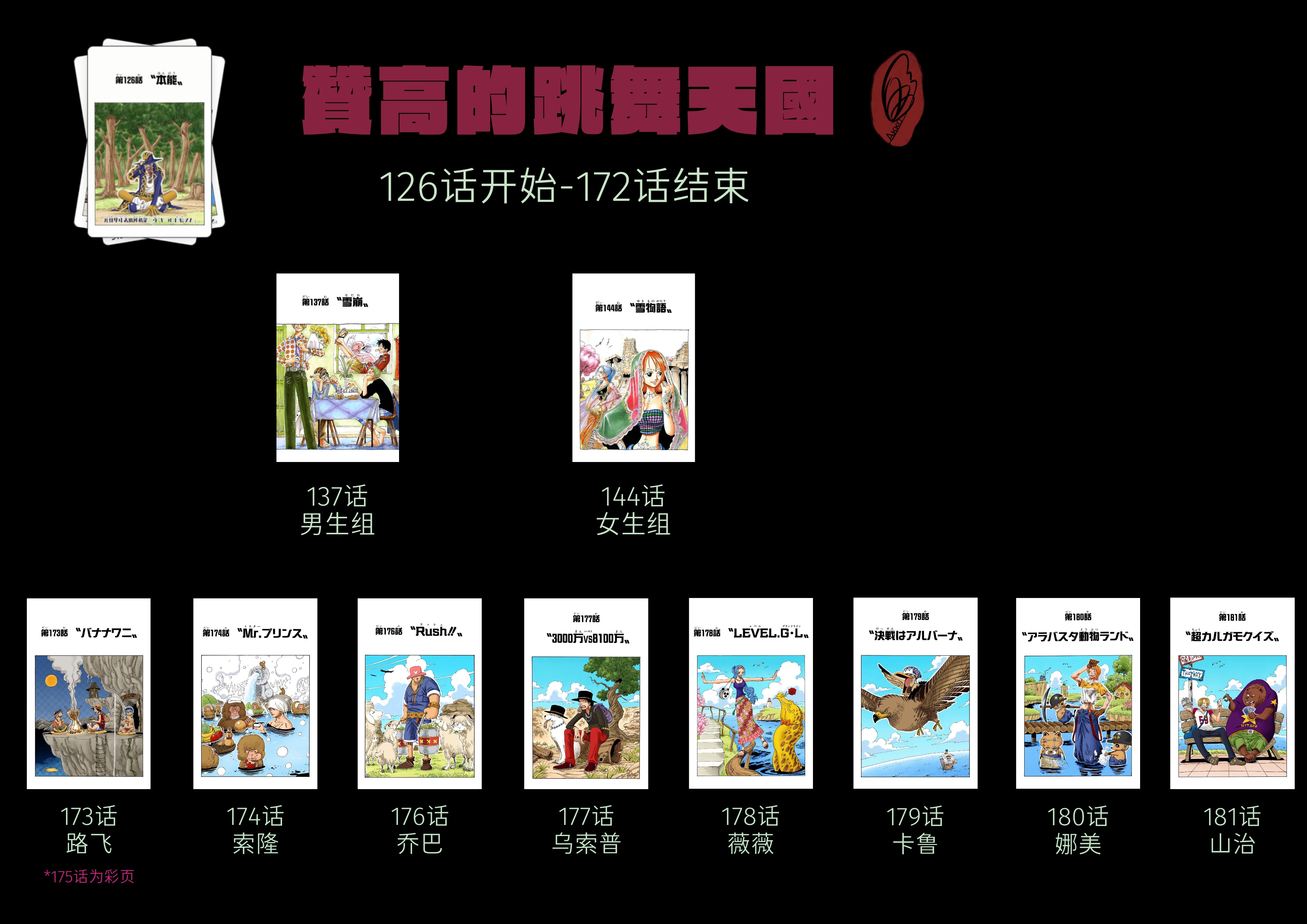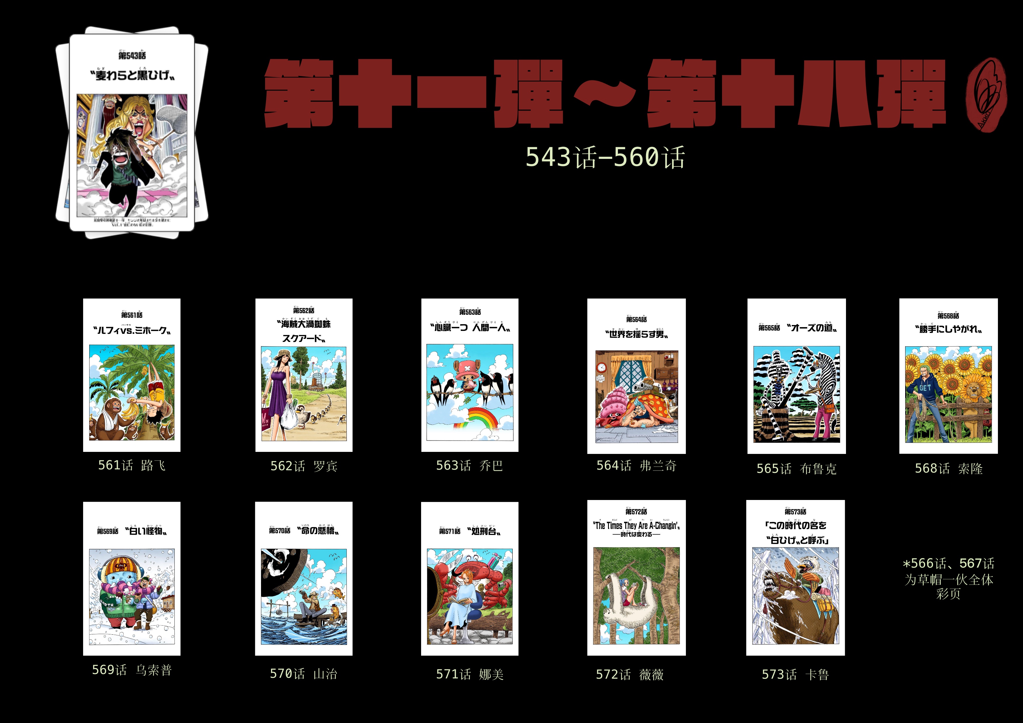 放上一个不知道能不能看得清的总览(长图,滑动条警告!) 东海篇的扉页比较多而繁杂,所以第一弹之前的以及第一弹与第二弹之间的扉页观察就偷懒跳过了~ 第二弹 克比和贝尔梅伯的奋斗日记 观察点:1.此时薇薇和卡鲁暂时上船,所以她们也出现在草帽一伙的动物剧场系列扉页(忘了是不是该这么称呼,但也暂时以此称呼) (默默思考,难道卡鲁担当动物的角色吗?) 2.这个阶段的草帽一伙的扉页是按照他们的“第X人”的顺序排列的 第三弹 赞高的跳舞天国 观察点:1.在第三弹连载期间,分别出现了当时船上的男生组和女生组的扉页(卡鲁:???) 2.第三弹结束后,乔巴出现动物剧场系列扉页,因为乔巴153话时加入草帽一伙 3.薇薇和卡鲁分别在不同的动物剧场扉页上 (果然卡鲁和薇薇出现在同一张扉页上是担当动物的角色吗?) 第四弹 小八的海底散步 观察点:1.第三弹连载期间的194话扉页为草帽一伙扉页(不含薇薇和卡鲁) 2.216话薇薇和卡鲁告别了草帽一伙,在此阶段她们没有属于她们的动物剧场扉页 3.罗宾加入,因此出现了罗宾的动物剧场系列扉页 4.233话扉页背景呈黑色,这是尾田老师为追悼一位名为“新贺吟平”的漫画家而刻意涂黑的 第五弹 瓦波尔的杂食万岁 观察点:1.薇薇和卡鲁重新出现在动物剧场扉页 (卡鲁:我觉得这次担任动物位的是睫毛~) 2.前几次路飞都是作为第一位开启动物剧场系列的,但这次不是 第六弹 艾斯的黑胡子大搜查线 观察点:1.乌索普客串出路飞的动物剧场扉页 (感觉就像当初乌索普出现在路飞的通缉令一样hhhh) 2.薇薇和卡鲁这是属于灵活上班,这次又没有动物剧场扉页了 第七弹 涅槃一不留神的蓝海生活 观察点:1.第六弹的扉页故事中出现了阿拉巴斯坦的相关角色 2.梅利唯一一次单独的动物剧场扉页 第八弹 Miss黄金周的作战名寻找巴洛克 观察点:1.前几弹的短pia篇页连载主人公都是按照出场顺序的,这一弹Miss黄金周率领巴洛克工作室成员强势插入 2.薇薇单独上班动物剧场扉页(卡鲁:???) 3.草帽一伙的动物剧场扉页和薇薇的动物剧场扉页之间以草帽一伙全员彩页(422话)分隔 第九弹 艾尼路的宇宙大作战 观察点:1.在开始第九弹故事(主人公艾尼路)前,存在一个名为「他们的现状」的系列,主要是讲述空岛的角色在草帽一伙离开后的现状 (个人感觉有点像世界的甲板系列的前身) 2.弗兰奇加入动物剧场扉页 3.卡鲁再次上班动物剧场扉页 4.与上一弹一样,草帽一伙的动物剧场扉页和薇薇的动物剧场扉页之间以草帽一伙全员彩页(483话)分隔 第十弹 CP9的任务外报告 观察点:1. 在开始第十弹故事(主人公CP9)前,存在一个名为「他们的现状」的系列,主要是讲述七水之都的角色在草帽一伙离开后的现状 2.布鲁克加入动物剧场扉页 3.薇薇这一张扉页,出演动物的,到底是睫毛呢还是砧板上的鱼呢~ 4.他们的现状都有承上启下的作用,介绍完空岛角色的现状,然后开启的是艾尼路的现状故事; 介绍完七水之都的角色的现状,然后开启的是CP9的现状故事 第十一弹——第十八弹 观察点:1.第十一弹——第十八弹拥有各自的名字,总的名字没有, 但这几弹都是除路飞以外的草帽一伙在被熊弹飞后各自的故事(每人两话) 2.算上薇薇和卡鲁(即使不算上也一样不算上也一样),这一阶段的动物剧场扉页以566话、567话两次彩页分割成两半 3.此阶段后的扉页感觉比较特殊,均为多人组合的动物剧场扉页,也出现除草帽一伙、薇薇和卡鲁以外的角色的动物剧场扉页 原贴是把两个部分分开的,但我觉得放在一起更像同一个系列 (话说,这个给我的感觉有点后来读者要求扉页形式的前身了) 两年后 观察点:1.漫画内的时间线来到了两年后,以草帽一伙2年后的全新造型彩页作为开篇,开启2年后造型的动物剧场扉页 2.此时的动物剧场扉页开始变更为读者要求系列 (本质上仍为动物剧场,但下文改称为读者要求扉页) 3.草帽一伙的动物剧场扉页的顺序再一次按照上船顺序排列 4.薇薇和卡鲁也没有缺席这一次的读者要求扉页,比较特殊的点在于前后一话均以草帽一伙的全体彩页作为分割,612话后开启新的短篇扉页连载 第十九弹 世界的甲板上 观察点:1.该短篇扉页连载主要讲述草帽一伙2年前所遇到过的人们的现状以及 对草帽一伙2年后全新出发的新闻的各种反应 2.该连载结束后紧接这的读者要求扉页为草帽一伙两两配对,索隆和山治的搭配完全可以说是经典搭配了 3.路飞与薇薇和卡鲁一起组成三人组出演读者要求扉页 第二十弹 卡里布的新世界狂笑曲 观察点:1.开始出现包含其他角色的读者要求扉页 2.薇薇和卡鲁在这个阶段作为起始引出别的角色的读者要求扉页,但此后不再享有“特殊性” 3.最后一张读者要求扉页里,出现了路飞 第二十一弹 甚平的海侠孤旅 观察点:1.第二十一弹连载期间,766话为纪念火影完结的联动扉页,出演人员为路飞、娜美、乔巴以及某知名人士 2.该阶段路飞出现在两张读者要求扉页上,而这两张扉页分别为这个阶段的读者要求扉页是开始和结束 3.乔巴开始积极参与不同人的读者要求扉页 4.罗人气的体现?和路飞一起出演作为开篇的读者要求扉页 第二十二弹 世界的甲板 5亿的男人篇 观察点:1.这一弹的短篇扉页连载主要讲述草帽一伙所认识的人对他们全新悬赏的反应 2.这一弹结束后,所紧接的的扉页为致敬乌龙派出所完结的联动扉页 3.除了自己个人的读者要求扉页,乔